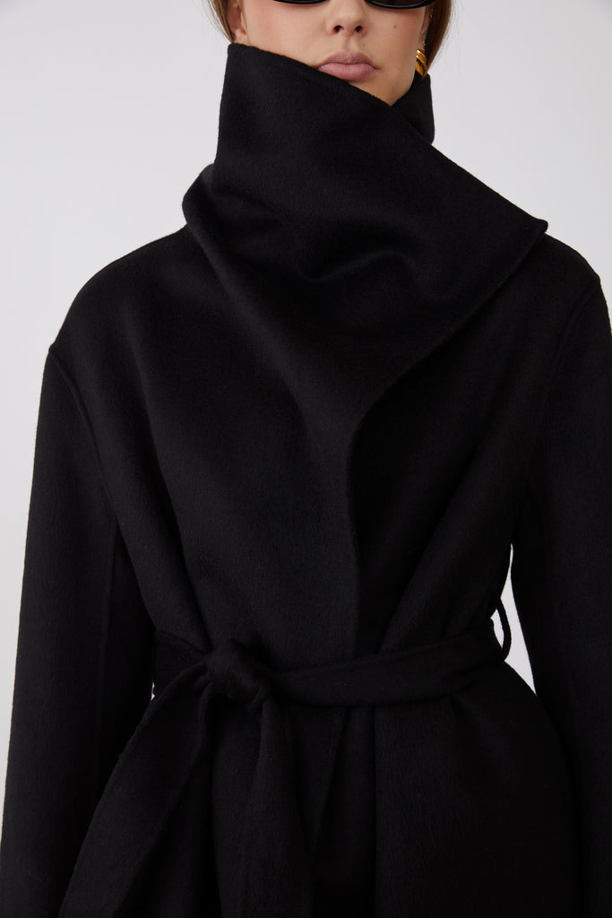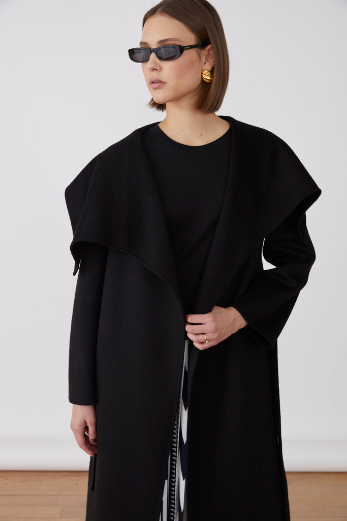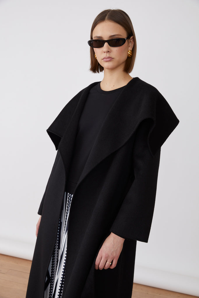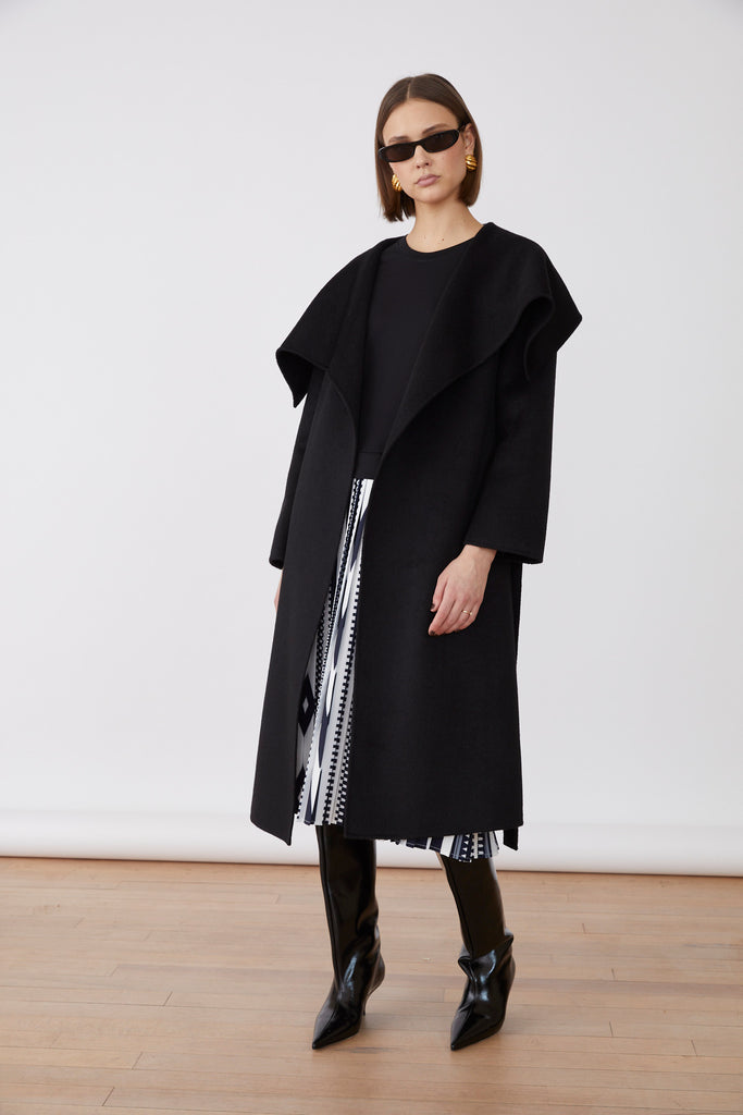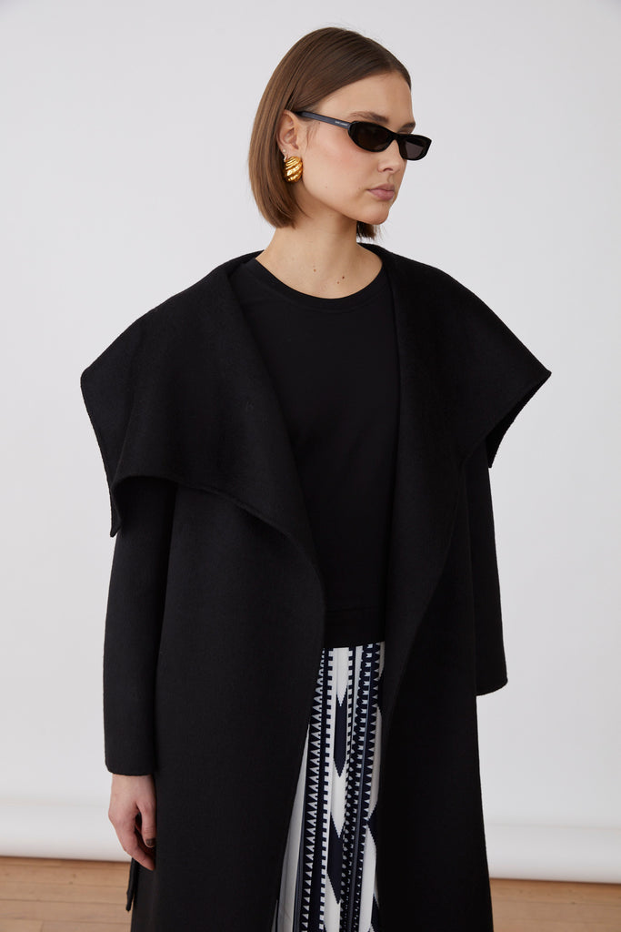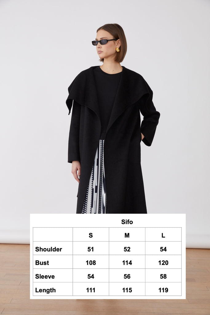 A statement in minimalism, the Sifo Coat features a dramatic draped collar and clean, longline silhouette. Crafted in a timeless black hue, it layers effortlessly over day-to-night looks — refined, versatile, and forever elegant.