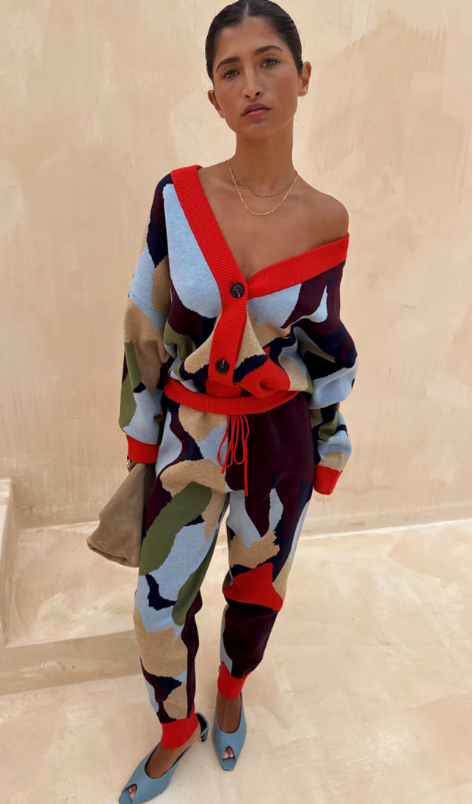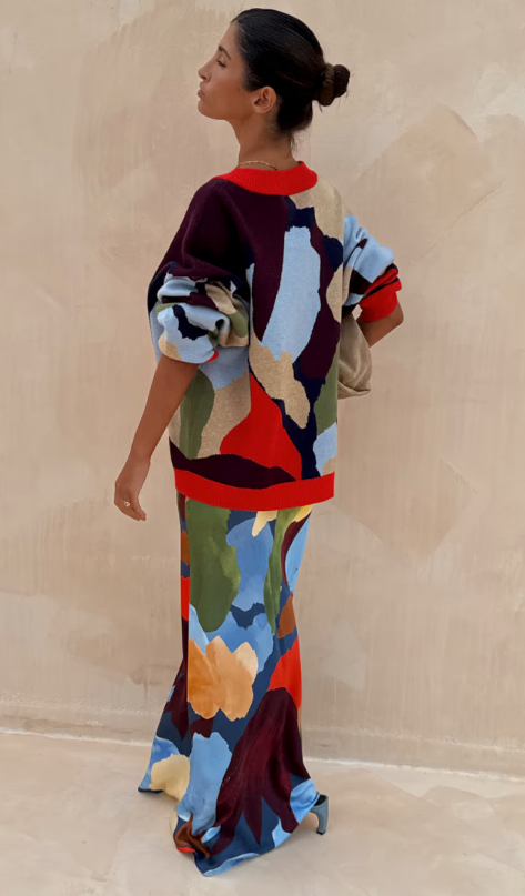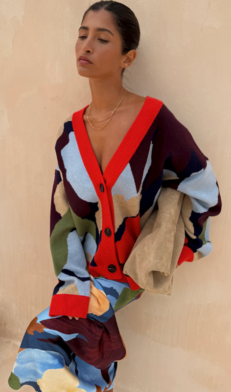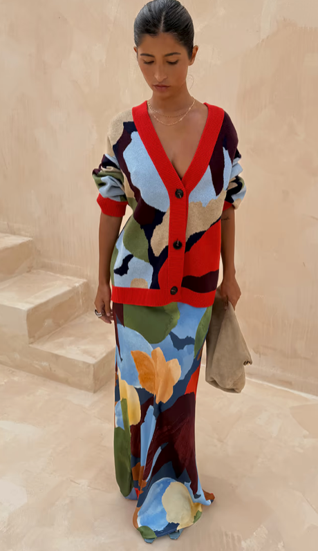 In a bright and bold abstract print, this soft touch cardigan is the perfect pop of colour to add to any outfit! With red trim detailing along the neckline, cuffs and pockets adding an extra element of texture to the simple silhouette. Wear with the matching dorris skirt for an effortless co-ord or over a tank and jeans.