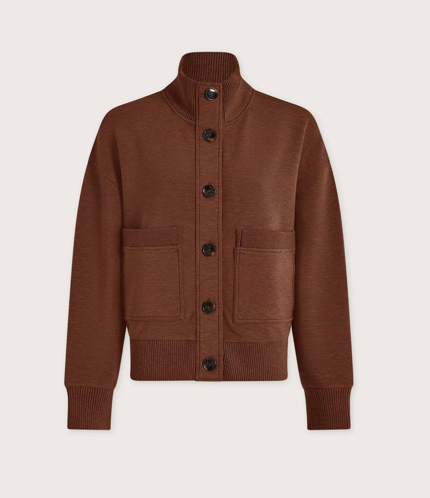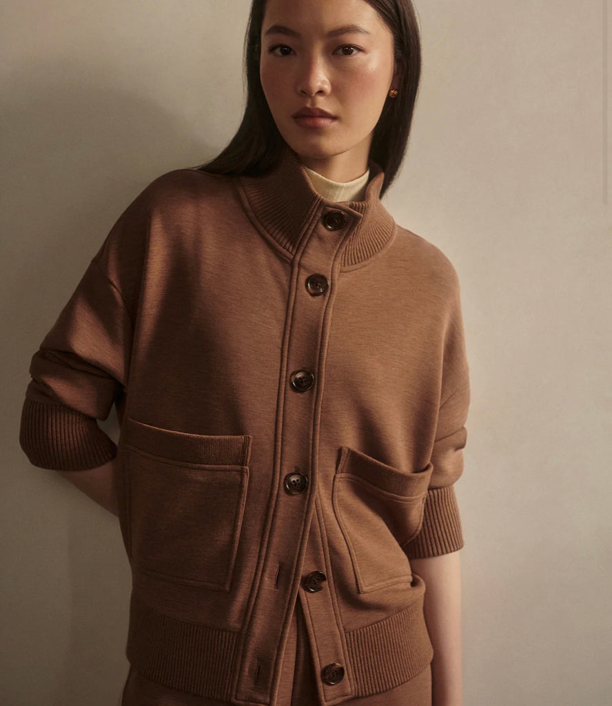 A classic button-through sweat crafted from our signature DoubleSoft® fabric for ultimate comfort and style, the Sabrina is your new layering staple. Slightly shorter than our regular length, it has an elegant high neck and a relaxed fit for versatile styling. Complete with buttons, chunky rib knitted details, and patch pockets.