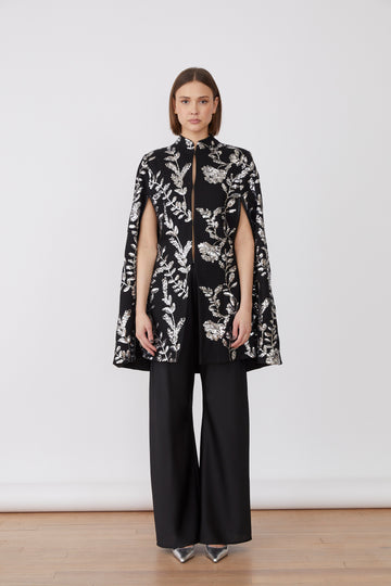 Dramatic yet refined, the Amour Cape is richly embroidered with metallic florals that shimmer against a jet-black base. Designed with elegant open sleeves and a structured silhouette, it’s the ultimate statement piece for evening occasions.