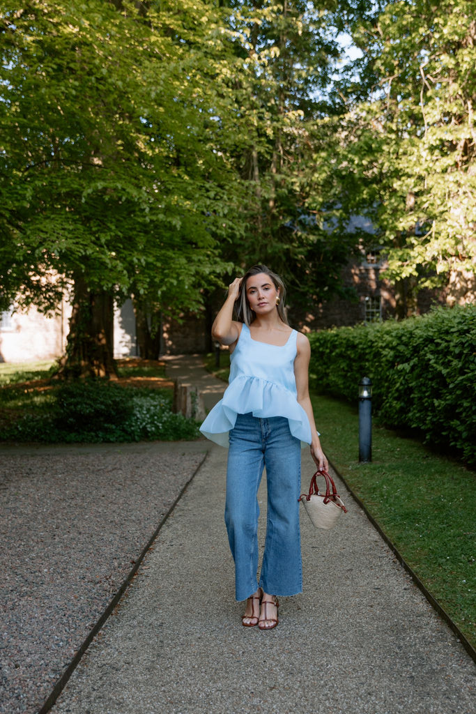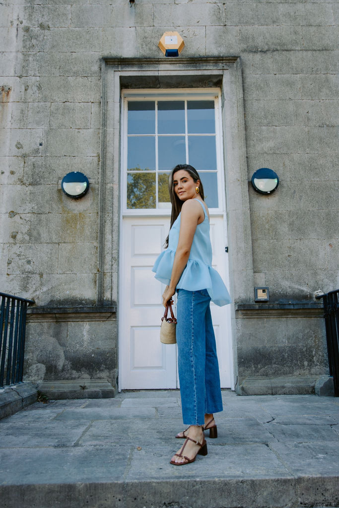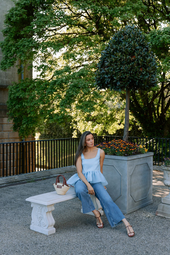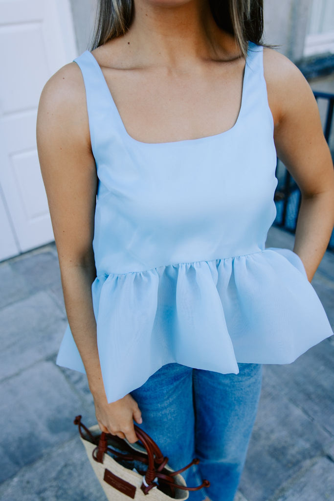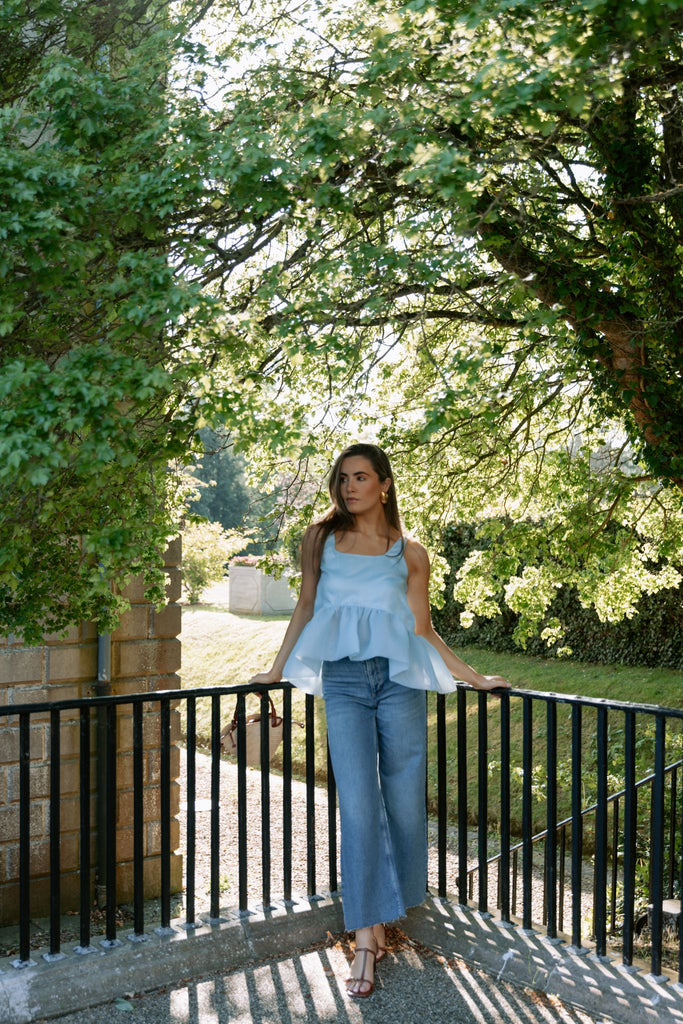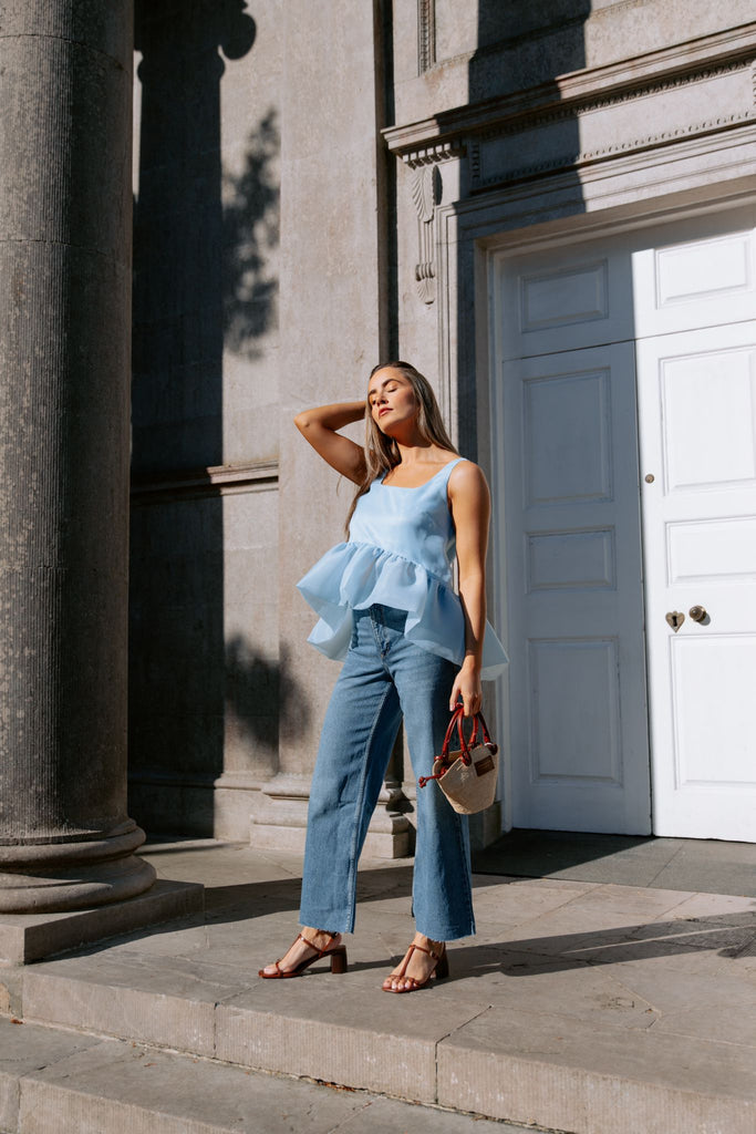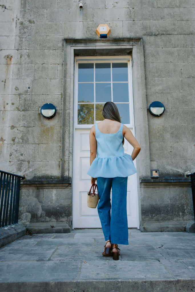 Designed for sunny days and nights alike, meet Belle Organza. Crafted from the prettiest blue organza, Belle has an elegant square neck line which is mirrored onto the back. The darted body gathers into a sculptured ethereal peplum.