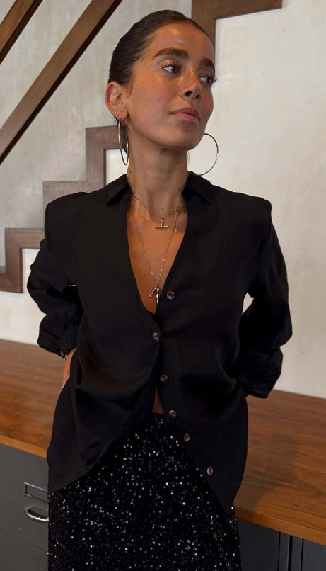 A super wearable black shirt, blouson sleeves and a floaty silhouette. A very slight sheerness for a luxe and lightweight feel but solid enough for everyday work wear. We have added contrast tortoise buttons for an extra touch of interest and gorgeous embroidered logo on the back neck.