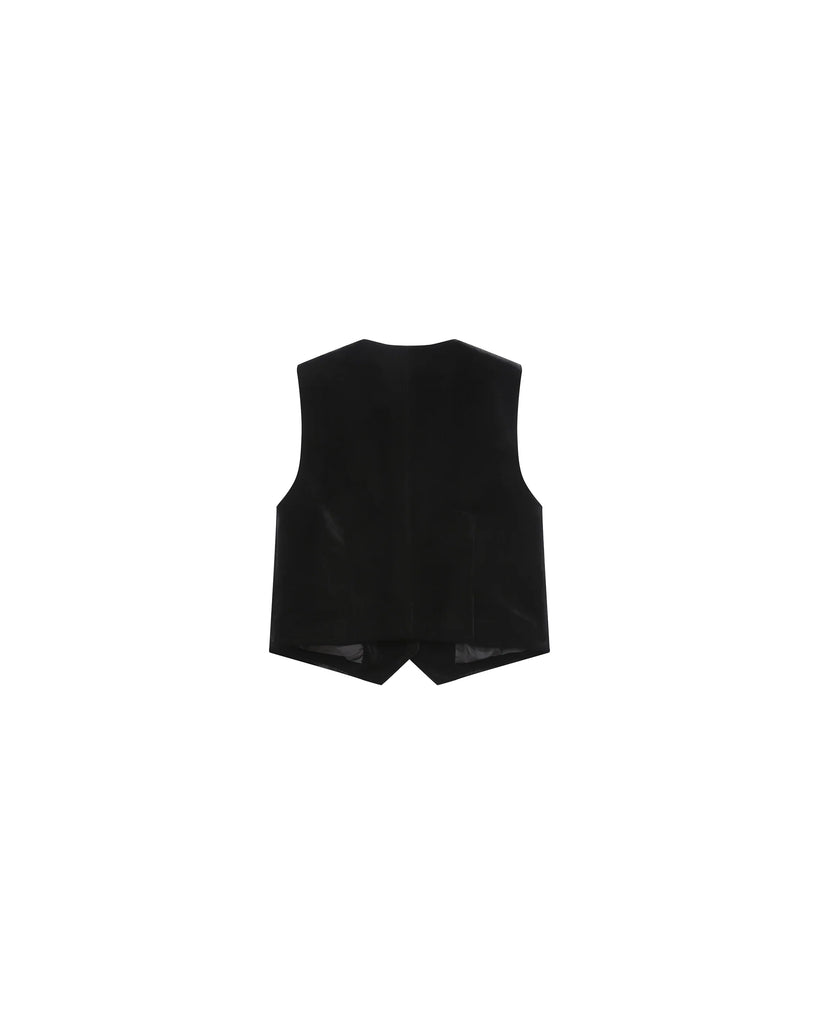 The house reinterprets this essential of the feminine/masculine wardrobe in a velvet fabric for a glamorous and feminine look. The straight cut of the TOTEM velvet vest structures the silhouette, while the V-neck adds a touch of femininity. The model features a buttoned front and two welt pockets on the front.
