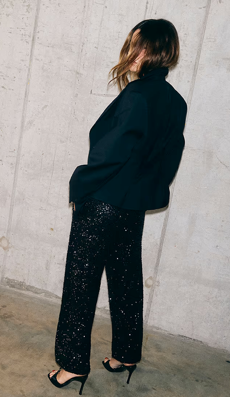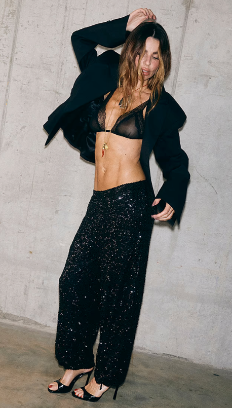 Drenched in black sequins that shimmer in the light, these trousers bring effortless glamour to any outfit! With an elasticated waistband for comfortability, side pockets and adjustable ties on the legs that allow you to style in a multitude of ways! Whether you're pairing with a bikini or dressing them up for a night out with the girls they're guaranteed to make a statement!