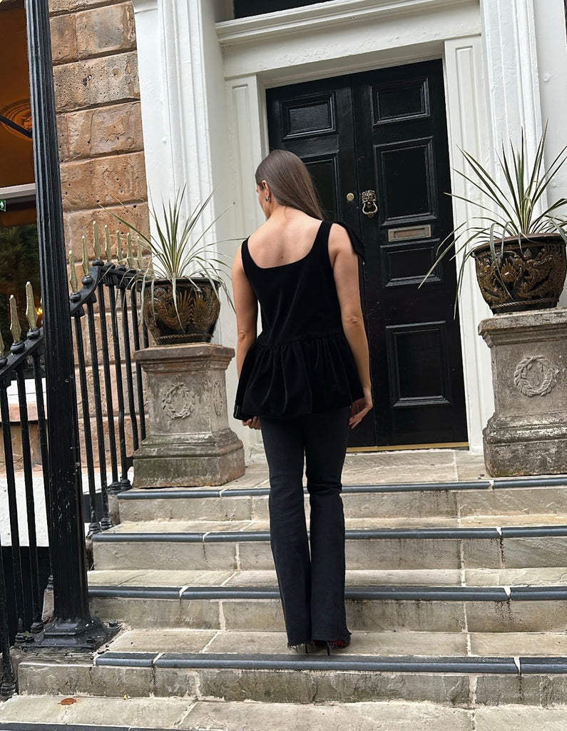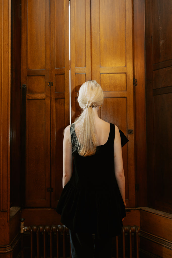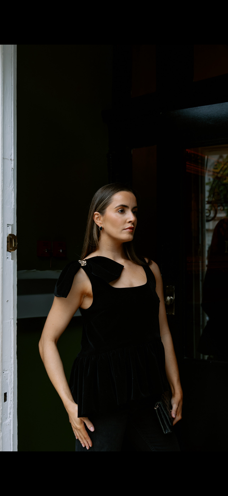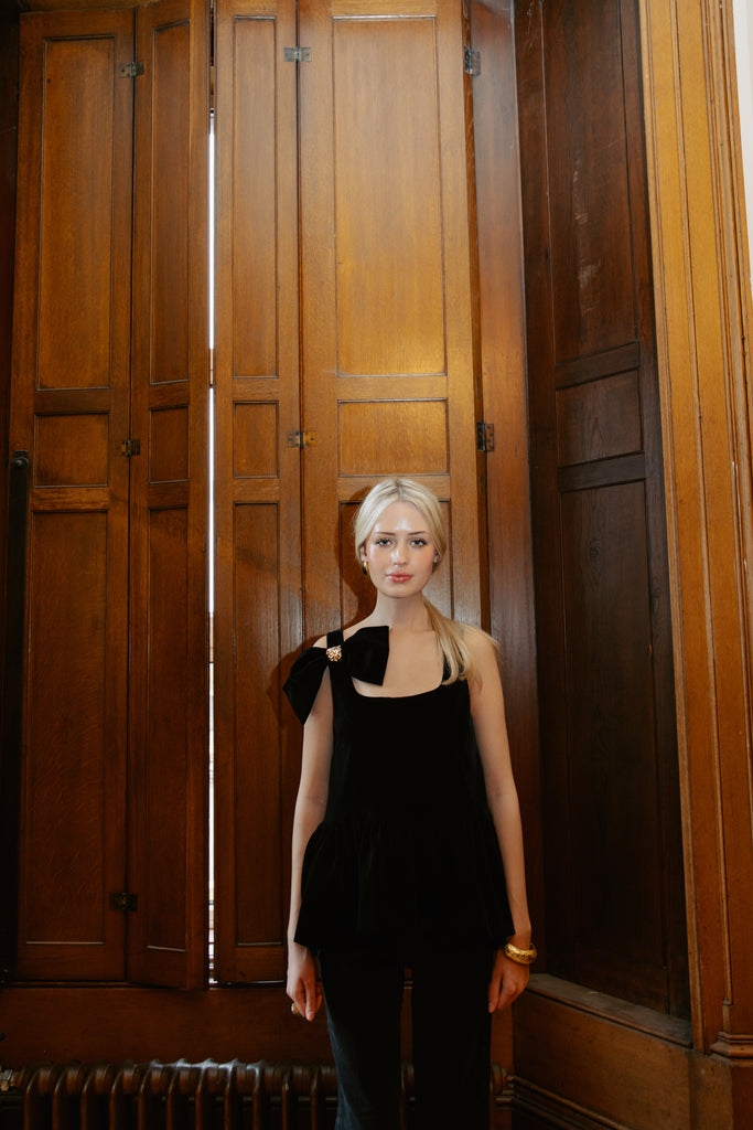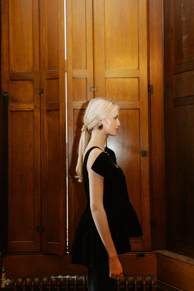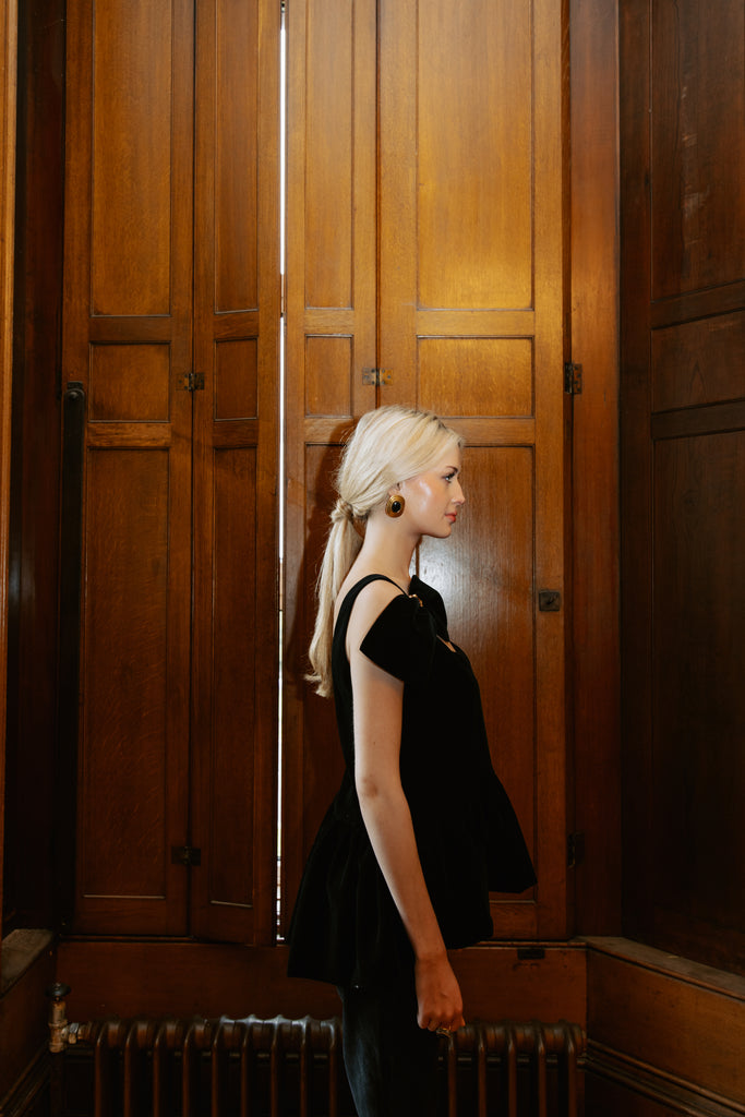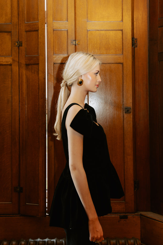 Introducing Belle — a statement piece from The Velvet Collection that balances timeless femininity with sculptural modernity. Crafted from sumptuous black velvet, Belle is defined by its romantic silhouette and dramatic bow detail — an oversized velvet bow adorned with a gold emblem that rests elegantly on one shoulder. The softly flared hem creates movement and lightness, while the square neckline frames the décolletage with refined simplicity.