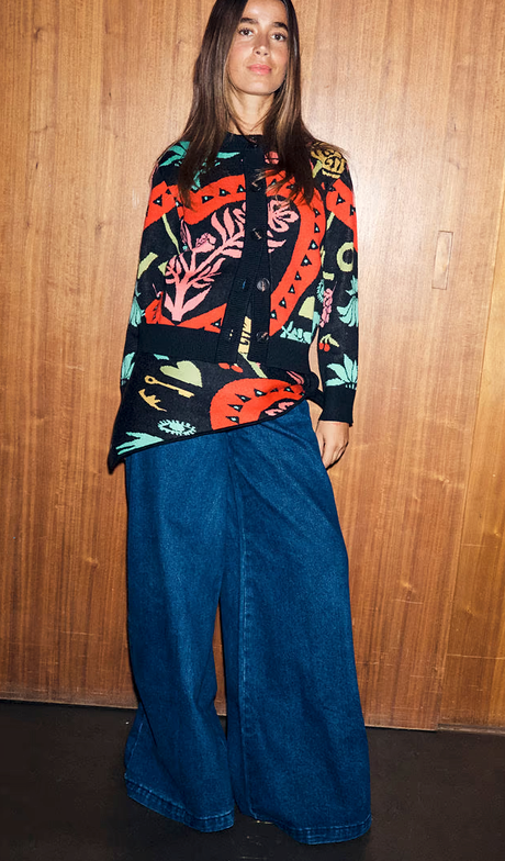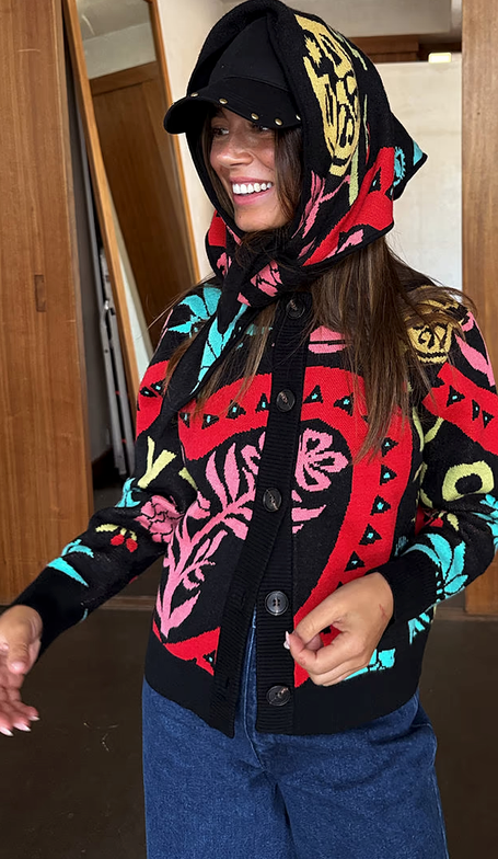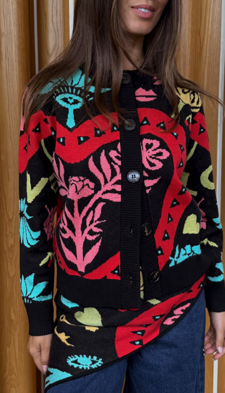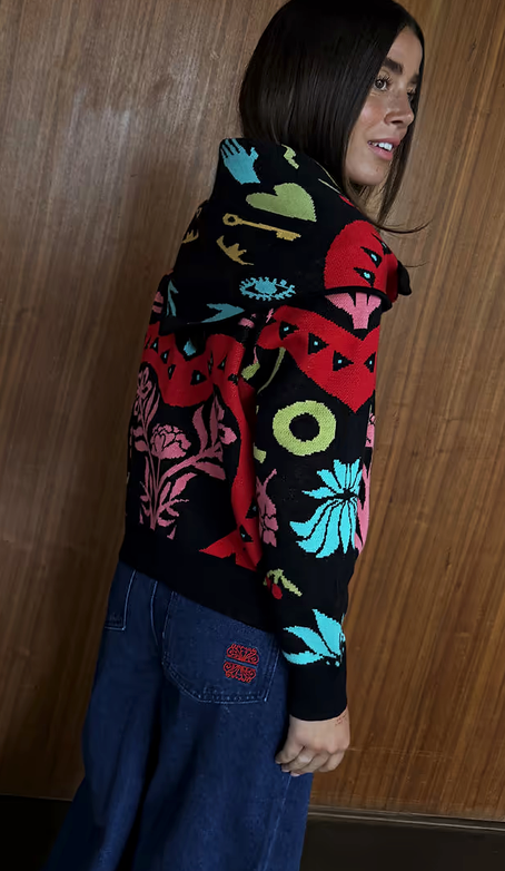 Our best selling knit base in our new Amara print! Ideal for the season, a light throw over for when it gets chilly in the evenings, and feels weighty to drape the frame nicely. Embroidered with our iconic NFD eye and heart motifs and flowers, hand painted by our in-house design team, making it gorgeously head turning.