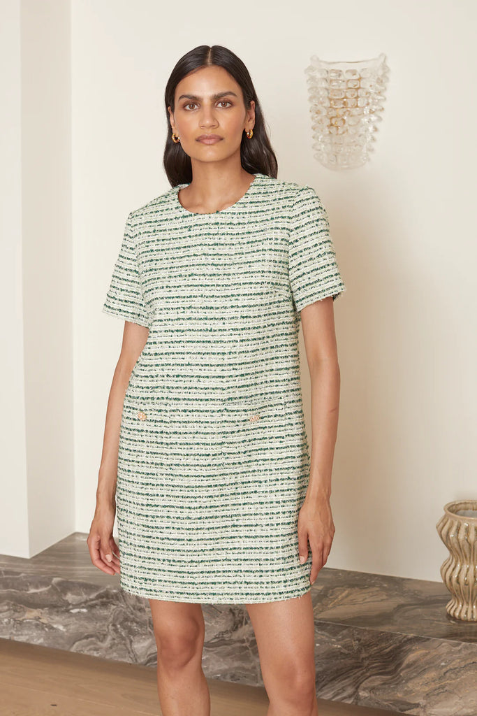 The Dillon Dress is a polished and sophisticated piece, featuring a classic tweed material and a timeless stripped design. The dress is adorned with embellished buttons and functional pockets for added convenience. Elevate your style with this elegant and versatile dress.