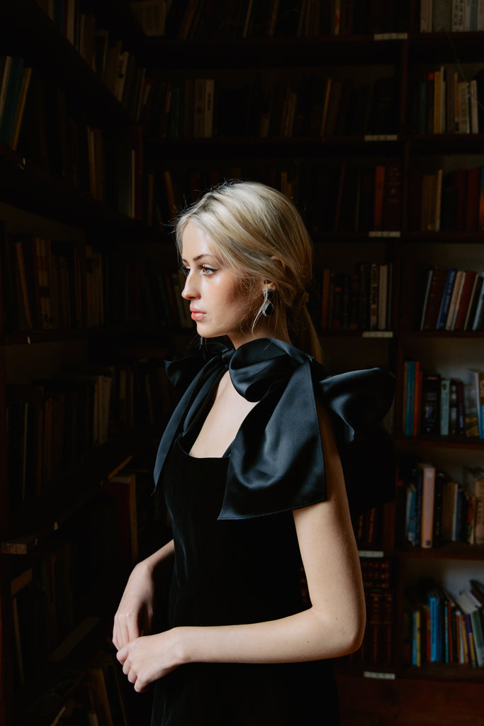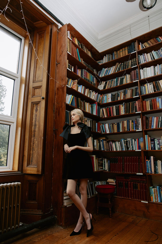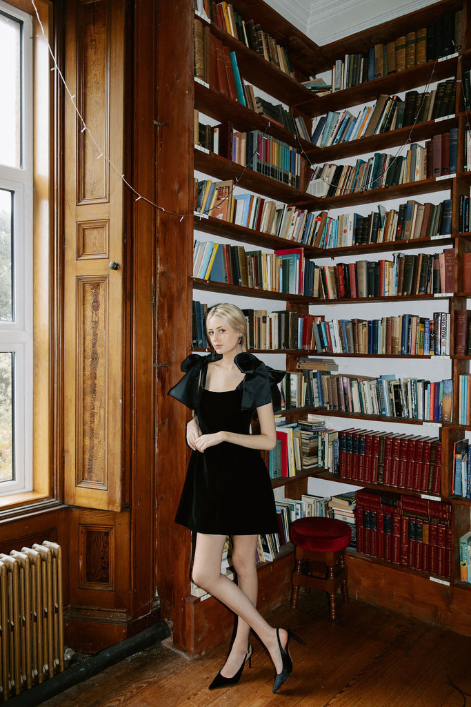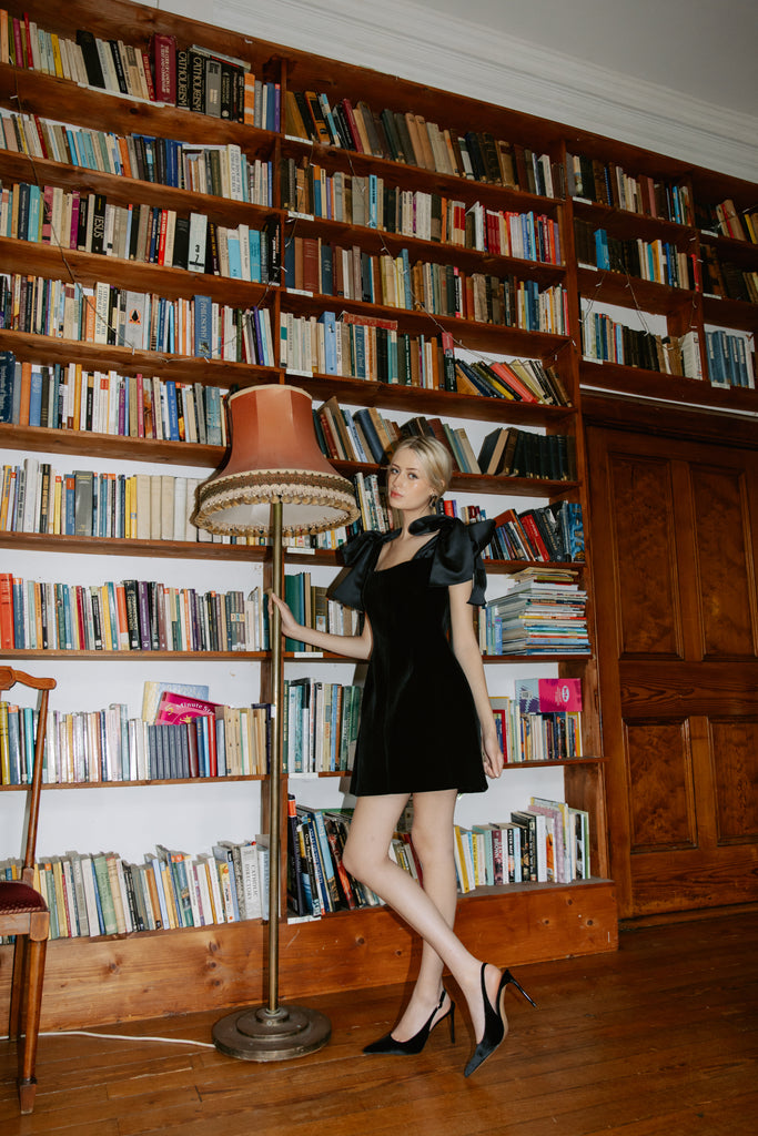 Introducing Martha — a love letter to evening elegance. Crafted from plush black velvet and framed by voluminous satin bows, Martha captures the spirit of timeless femininity with a contemporary edge. The sculpted square neckline and softly flared mini silhouette create a balance of structure and softness, designed to flatter and captivate in equal measure.