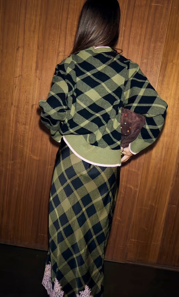 Soft touch knit base in a chic olive green tartan print that’s perfect for the transition into the autumnal months. In true NFD flare, we’ve inverted the pattern to creat a truly unique print that adds a pop of colour to your wardrobe while still keeping it classic. Pair with the matching maeva skirt for an effortless, easy to wear co-ord.