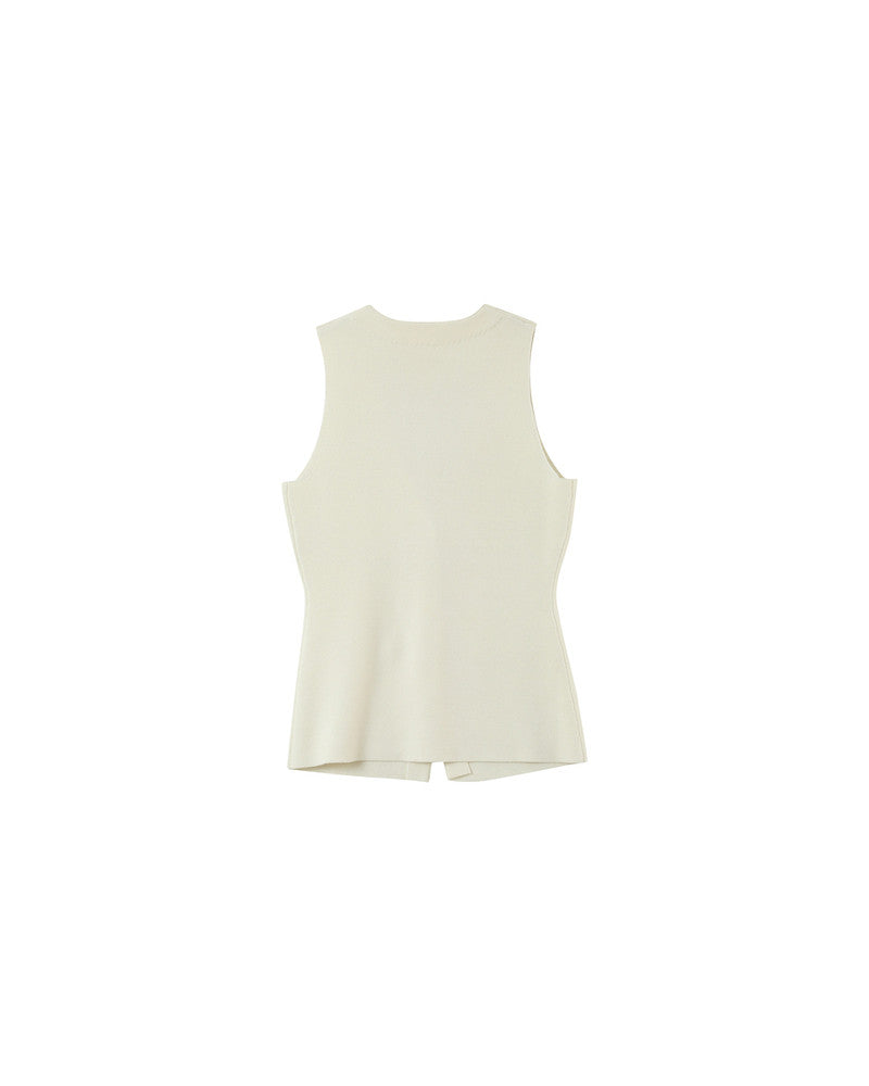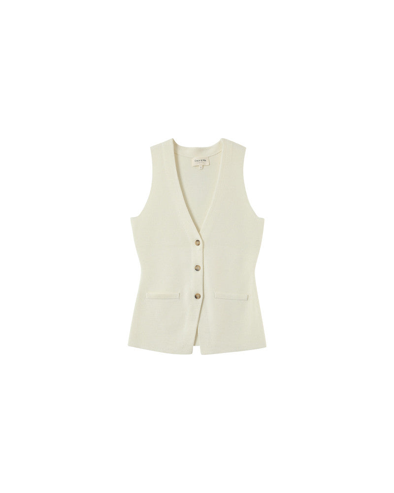 The fitted and tailored cut shapes the silhouette, making the PANAMA Knit Cardigana decidedly feminine and sophisticated piece. The sleeveless design with a V-neck is inspired by tailoring, offering minimalist and clean lines. The PANAMA Sleeveless Cardigan features a buttoned front opening and a faux piped pocket.