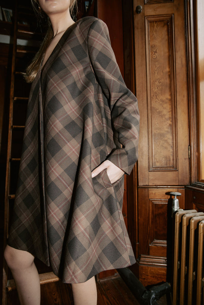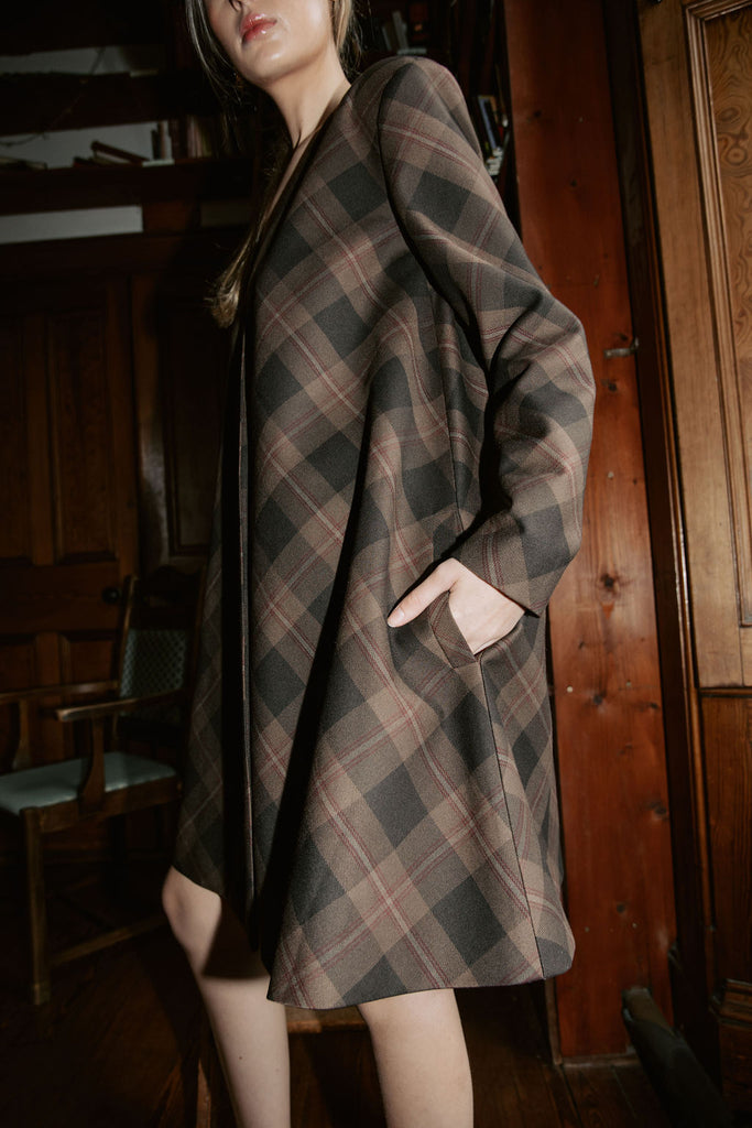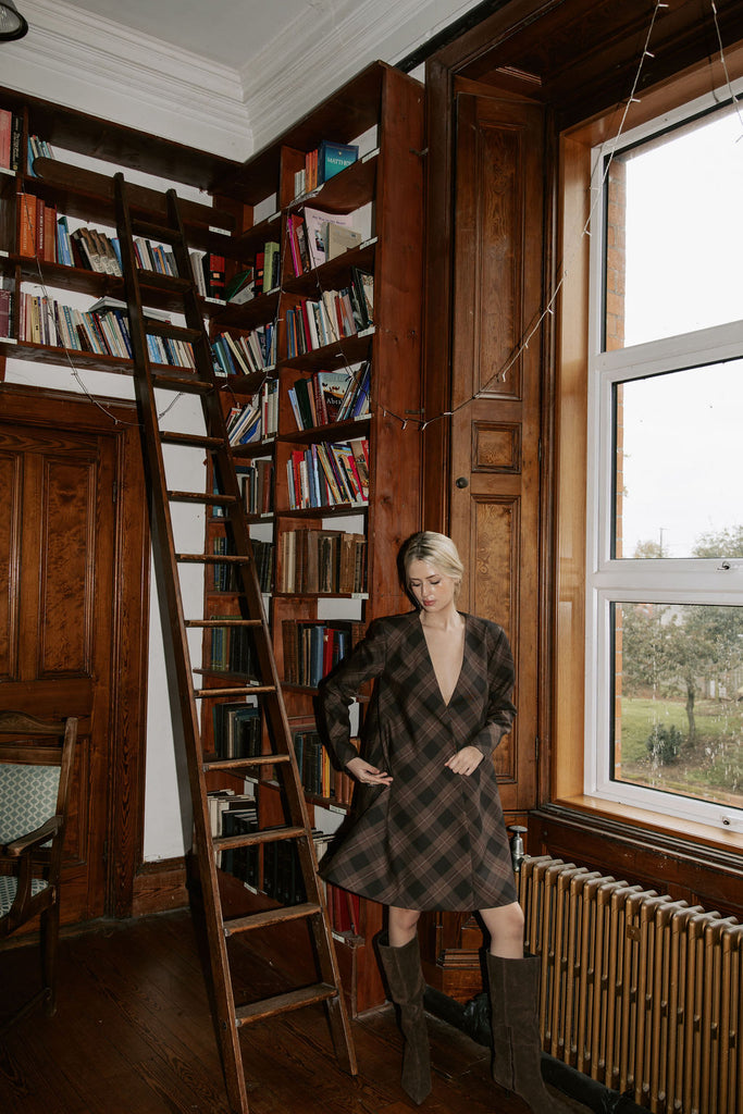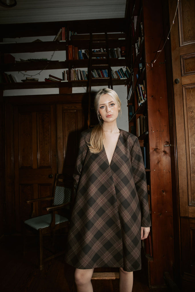 Introducing Sabrina — a modern classic plaid Swing dress. Cut from a soft brown plaid, this swing dress is defined by its fluid silhouette and V neckline, balancing simplicity with quiet statement. The gently structured shoulders and subtle flare through the body create a shape that feels both tailored and undone — an elevated take on relaxed dressing.