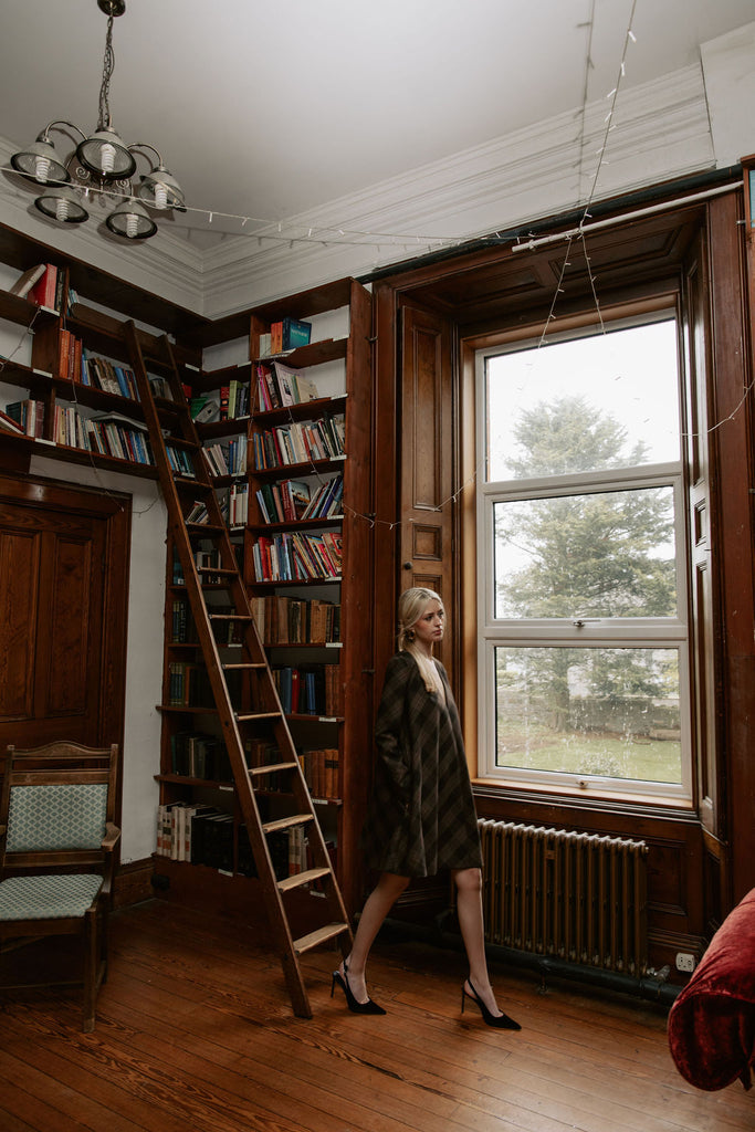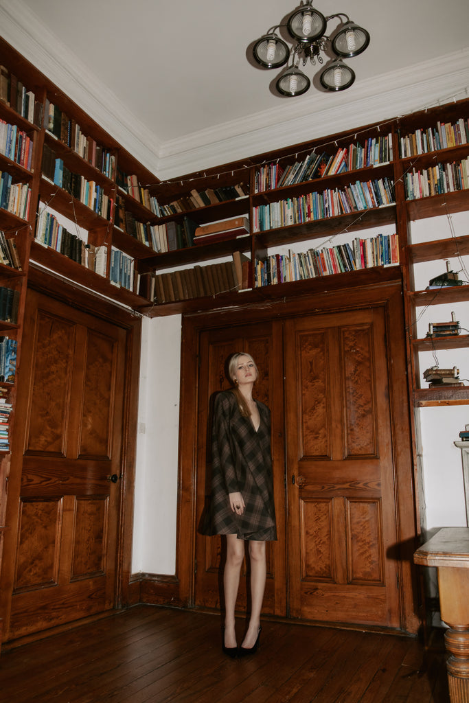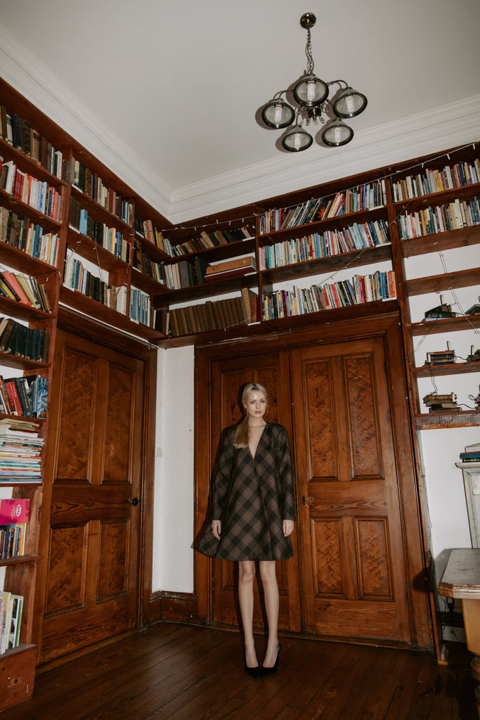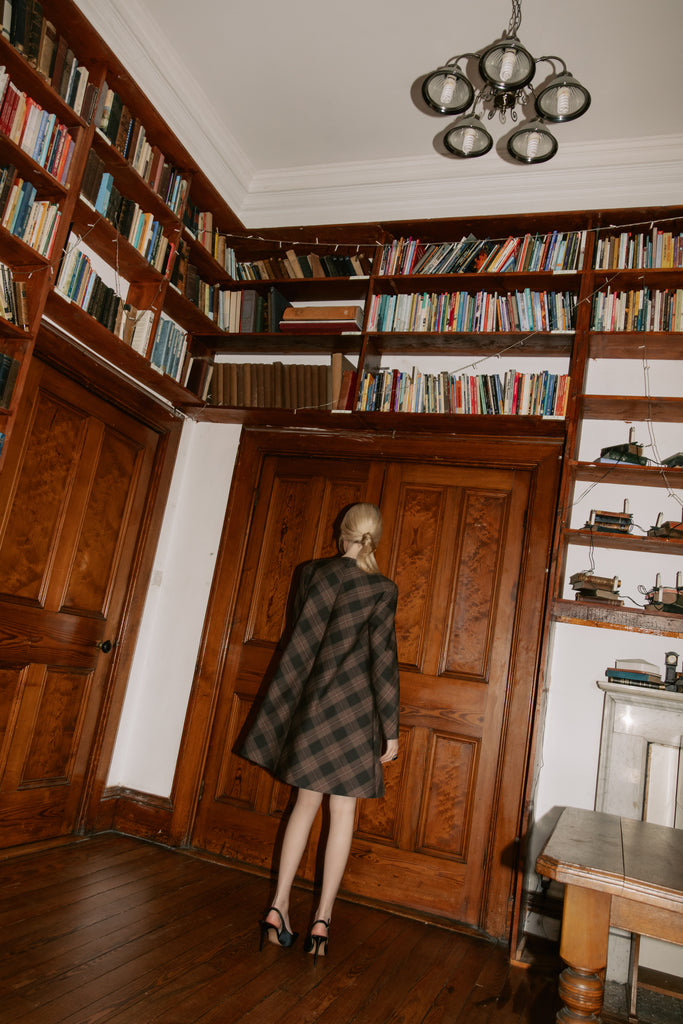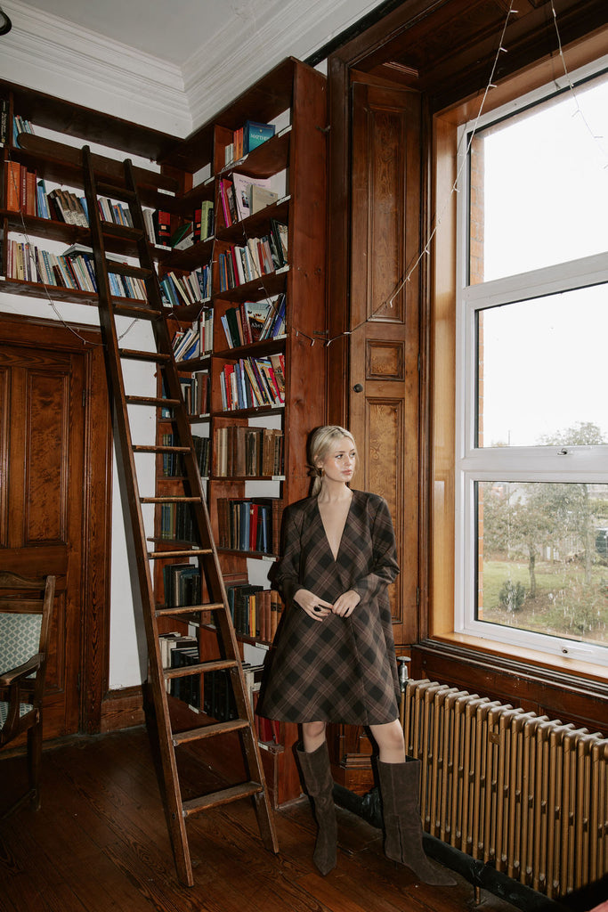 Introducing Sabrina — a modern classic plaid Swing dress. Cut from a soft brown plaid, this swing dress is defined by its fluid silhouette and V neckline, balancing simplicity with quiet statement. The gently structured shoulders and subtle flare through the body create a shape that feels both tailored and undone — an elevated take on relaxed dressing.